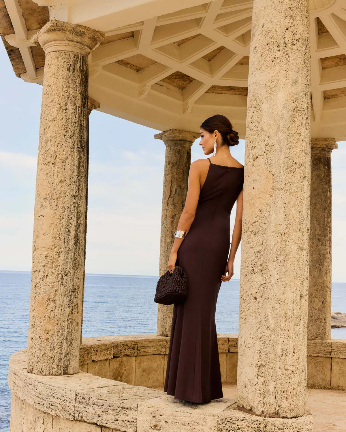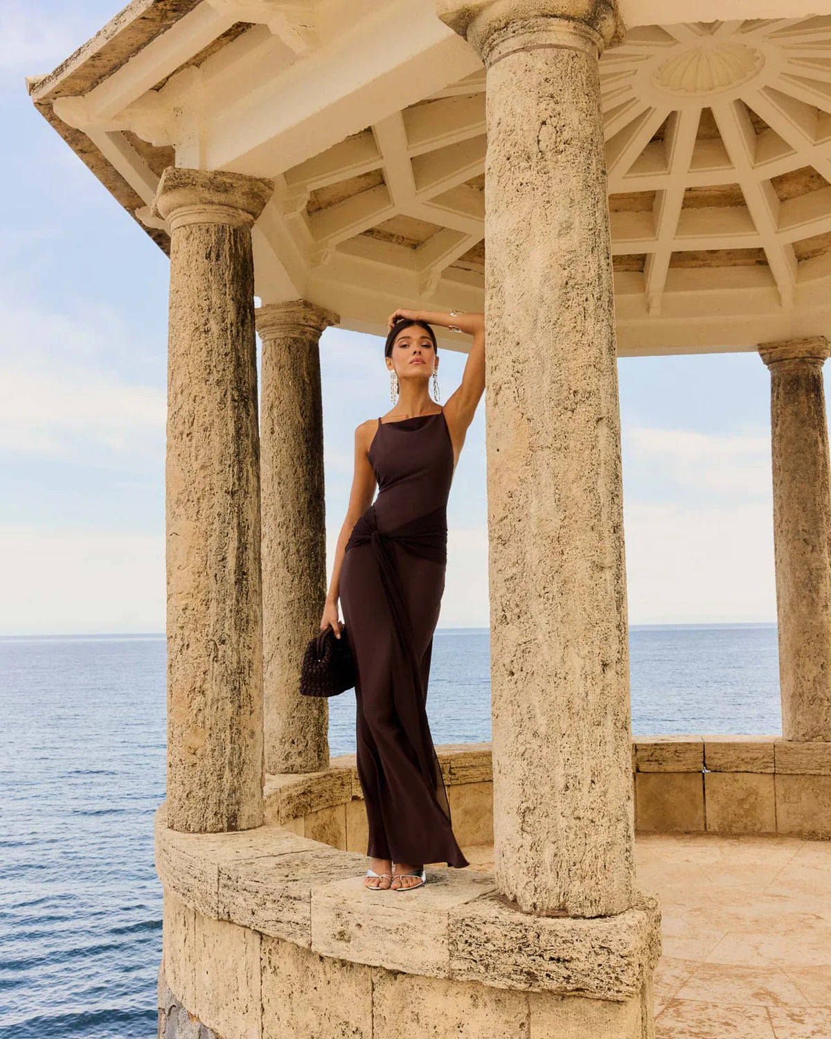 Long dress with straight neckline and front knot detail in tone-on-tone chiffon